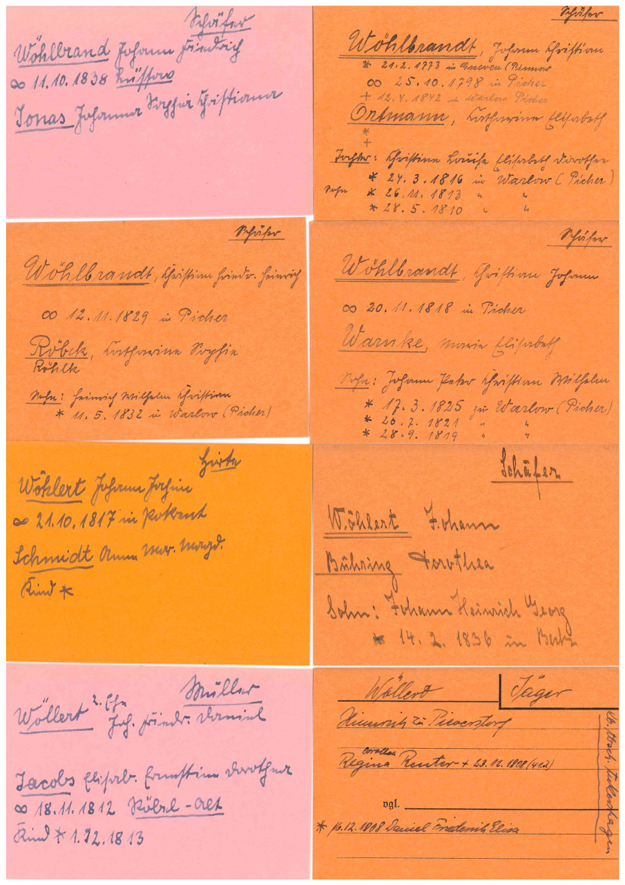 Die Karteikarten enthalten Lebensdaten zu Personen, die i.d.R. einem nichtsesshaften bzw. unsteten Beruf nachgingen. Es finden sich folglich Berufe wie Schäfer, Holländer, Hirten, Müller und Mühlengesellen bzw. -knechte, Jäger, Schulmeister und Lehrer, aber auch Schmiede und Fischer, Pächter, Pensionäre und Gutsbesitzer. Der Umfang der auf den Karteikarten niedergeschriebenen Daten ist sehr unterschiedlich. Es gibt Karten, die eine mehr oder weniger vollständige Aufstellung der gesamten Familie beinhalten, aber auch Karten, die nur einen Familiennamen und Ort und/oder das Jahr der Erwähnung angeben. Dazwischen ist alles möglich.