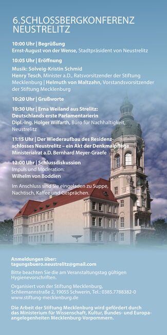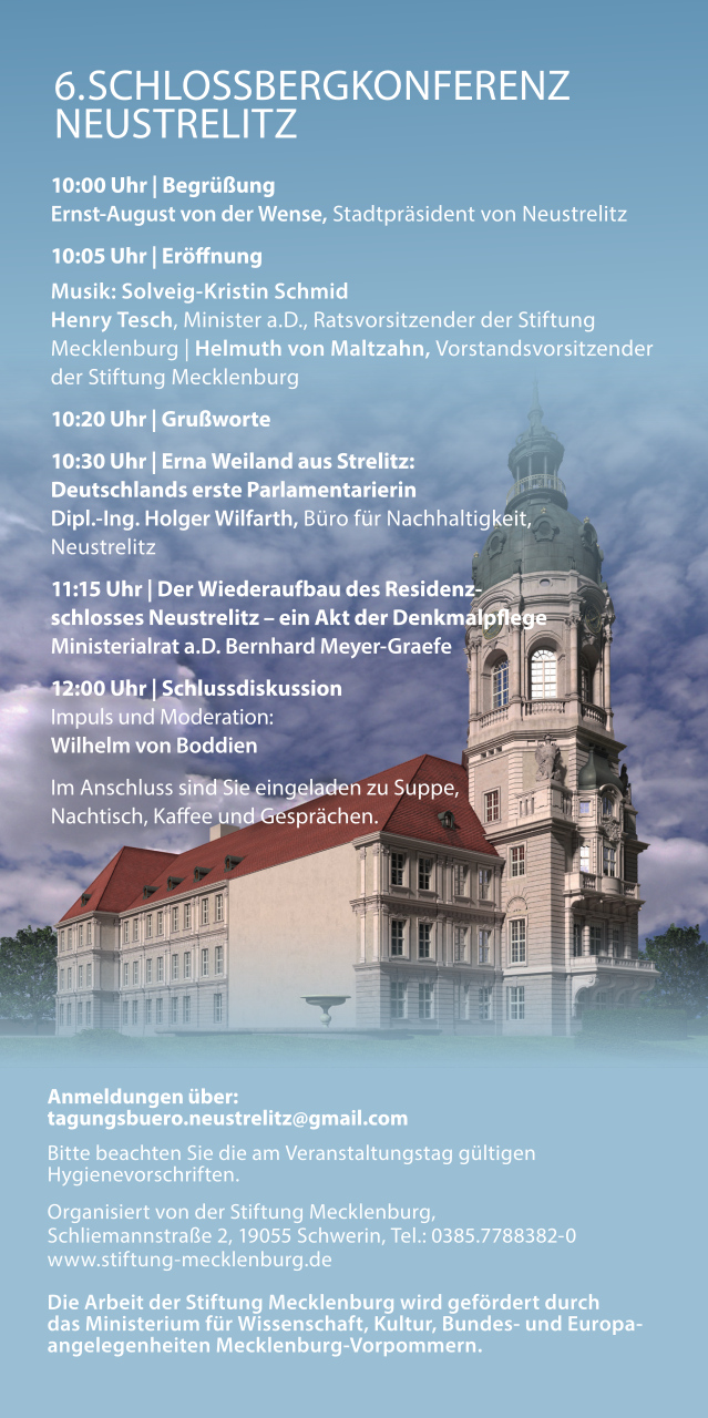 In diesem Jahr laden die Stiftung Mecklenburg und die Stadtvertretung Neustrelitz zum sechsten Mal dazu ein, miteinander über die Zukunft des Neustrelitzer Schlossbergareals zu sprechen.