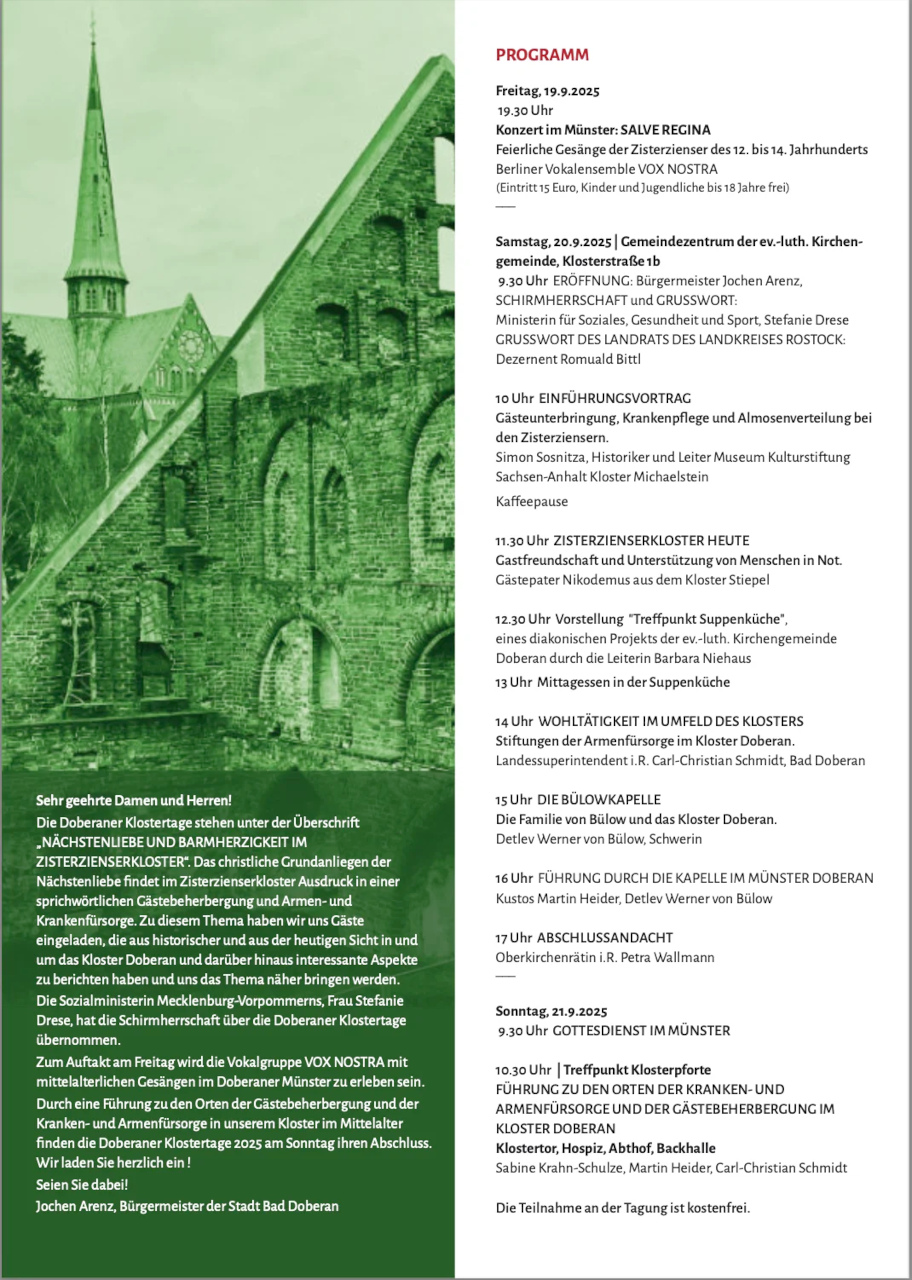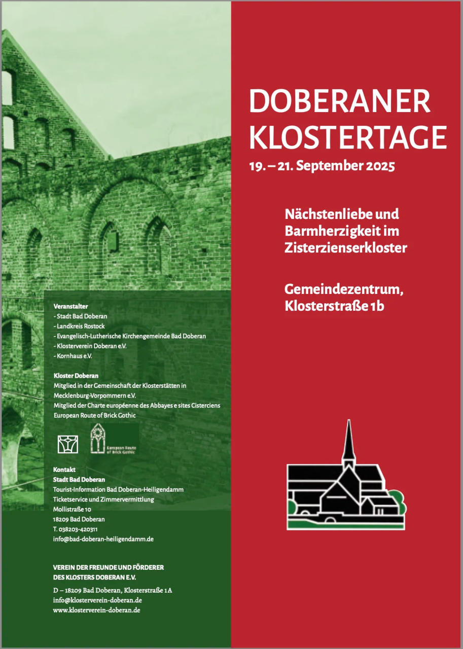 Die Doberaner Klostertage stehen unter der Überschrift "NÄCHSTENLIEBE UND BARMHERZIGKEIT IM ZISTERZIENSERKLOSTER". Das christliche Grundanliegen der Nächstenliebe findet im Zisterzienserkloster Ausdruck in einer sprichwörtlichen Gästebeherbergung und Armen- und Krankenfürsorge. Zu diesem Thema haben wir uns Gäste eingeladen, die aus historischer und aus der heutigen Sicht in und um das Kloster Doberan und darüber hinaus interessante Aspekte zu berichten haben und uns das Thema näher bringen werden