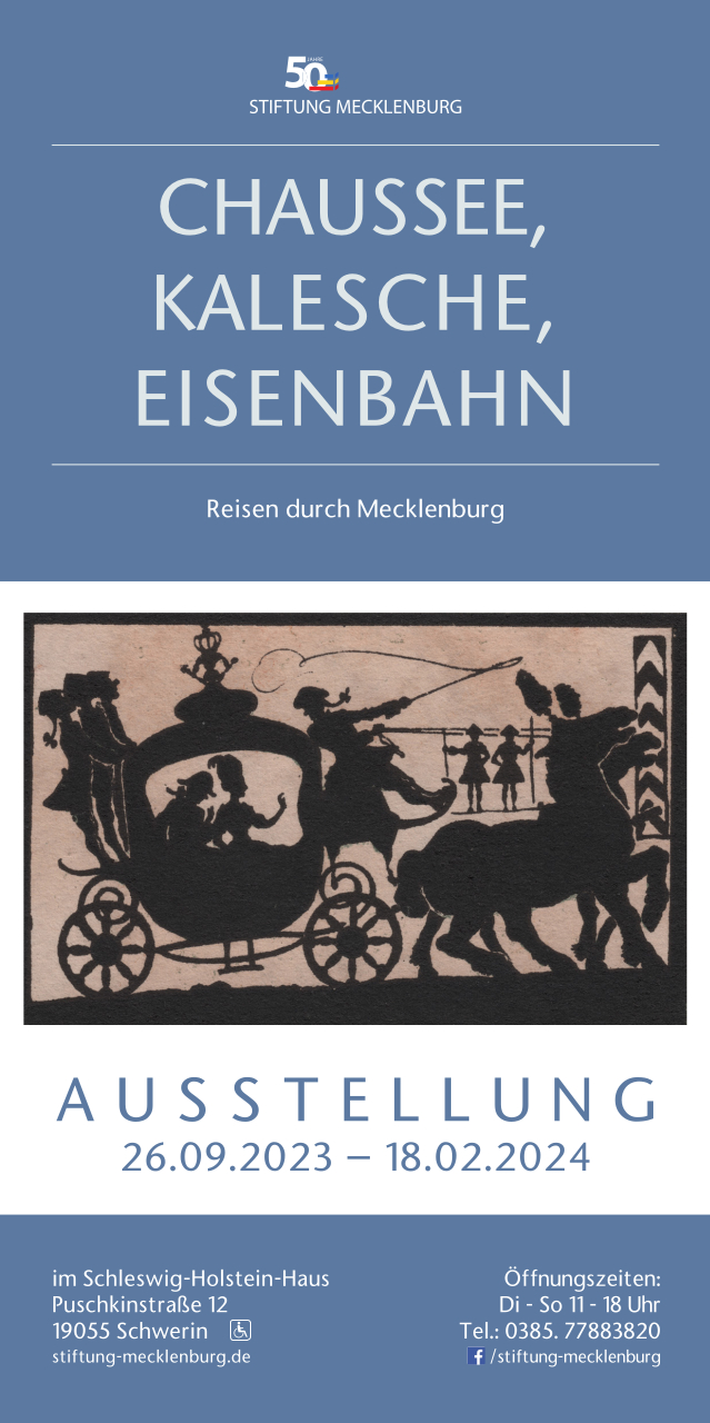 Am 26. September 2023 öffnet die Stiftung Mecklenburg in Schwerin ihre neue Sonderausstellung „Chaussee, Kalesche, Eisenbahn. Reisen durch Mecklenburg“ mit einem zeitlichen Schwerpunkt auf dem 19. Jahrhundert.