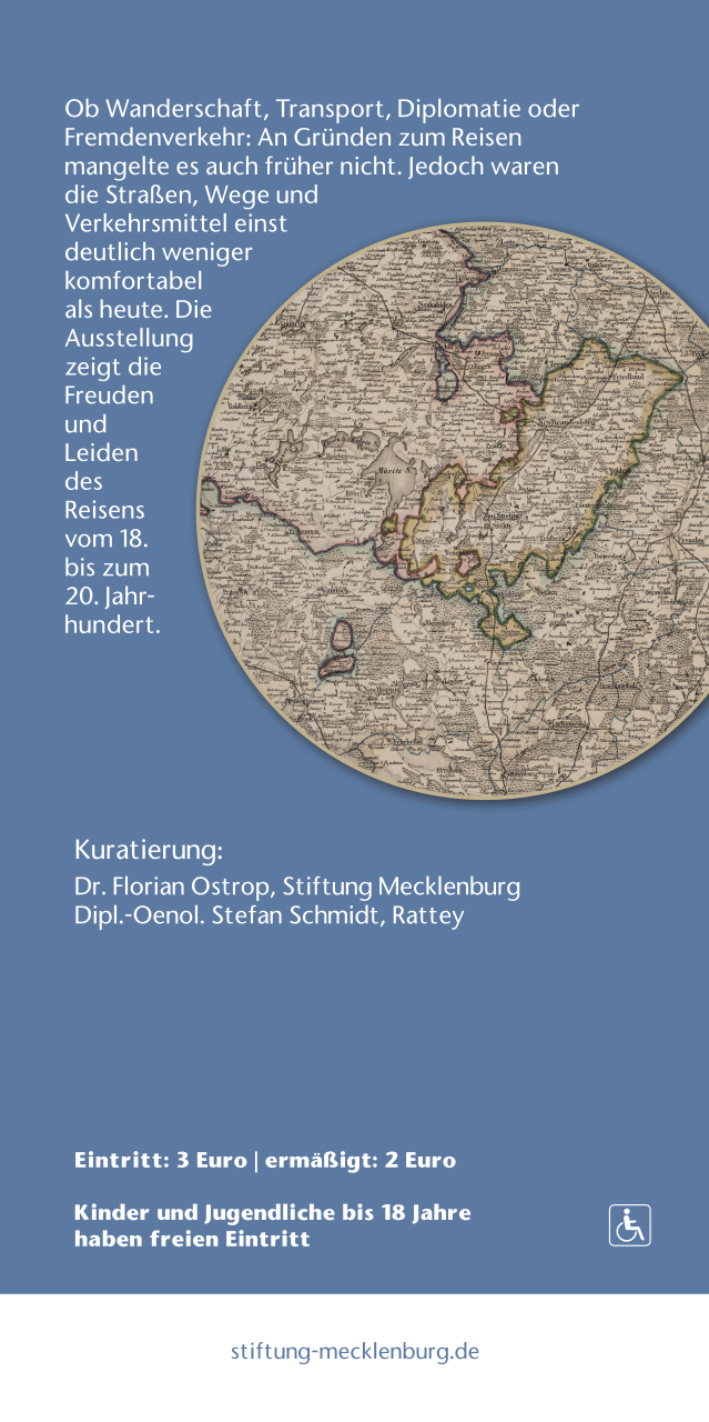Neben den einst recht holprigen Verkehrsverbindungen im Lande stehen Menschen im Fokus, die sich aus ganz unterschiedlichen Motiven auf den Weg machten. Diese Beweggründe spiegeln sich in ungewöhnlichen Gepäckstücken ebenso wie in Geleitbriefen, Pässen und anderen Dokumenten. Ob zu Fuß, mit Pferd oder Kutsche und schließlich zunehmend mit der Eisenbahn – längst nicht alle waren freiwillig in Mecklenburg unterwegs. Und der unvermeidlichen letzten Reise ins Jenseits konnte sich natürlich niemand entziehen.