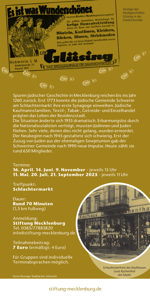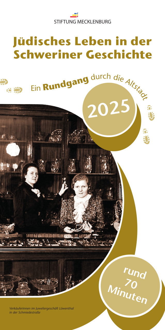 Am 16. April gibt es erstmals Gelegenheit, einen neuen Rundgang der Stiftung Mecklenburg über „Jüdisches Leben in der Schweriner Geschichte“ zu erleben. Ausgehend vom Schlachtermarkt, wo die jüdische Gemeinde Schwerin ihre erste Synagoge im Jahr 1773 einweihte, geht es zu den Spuren jüdischer Kaufmannsfamilien. Diese waren im Textil-, Tabak-, Getreide- und Einzelhandel tätig und prägten das Leben der Residenzstadt. Die Situation änderte sich 1933 dramatisch. Erbarmungslos durch die Nationalsozialisten verfolgt, mussten Jüdinnen und Juden fliehen. Sehr viele, denen dies nicht gelang, wurden ermordet. Der Neubeginn nach 1945 gestaltete sich schwierig. Erst der Zuzug von Juden aus der ehemaligen Sowjetunion gab der Schweriner Gemeinde nach 1990 neue Impulse. Heute zählt sie rund 650 Mitglieder.