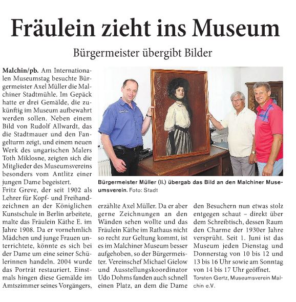 Der Blitz berichtet in seiner heutigen Ausgabe zum Internationalen Museumstag über ein Geschenk des Bürgermeisters von Malchin, Axel Müller, an das Malchiner Museum. Mit dabei unser sehr aktives Vereinsmitglied Udo Dohms (Bildmitte).