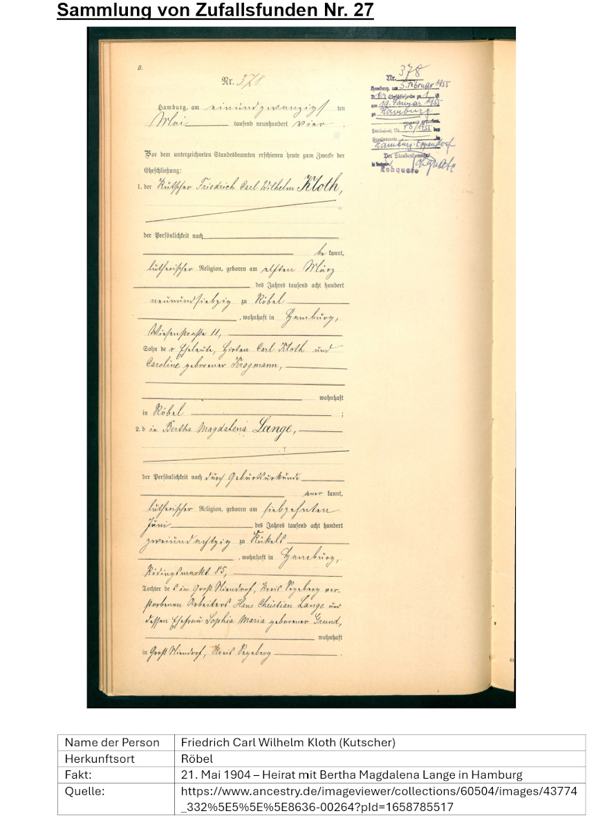 Auf Anregung unseres Mitglieds Katja Peters möchten wir damit beginnen, Zufallsfunde aus verschiedenen Quellen in unserer Datenbank Forschungsergebnisse in einer vereinheitlichten Form zu sammeln und zur freien Nutzung zur Verfügung zu stellen. Ausgangspunkt der Idee waren Katja Peters Funde von Mecklenburgern in Schleswig-Holsteiner und Hamburger Datensammlungen zum Beispiel bei „Archion“ oder „Ancestry“. Die ersten 29 Funde gehen nun online. Die Suche ist nach Namen, Orten oder Berufen (je nach dem, was angegeben) möglich. Eine Anmeldung zum Download ist für die Zufallsfunde nicht notwendig, sie sind frei zugänglich.