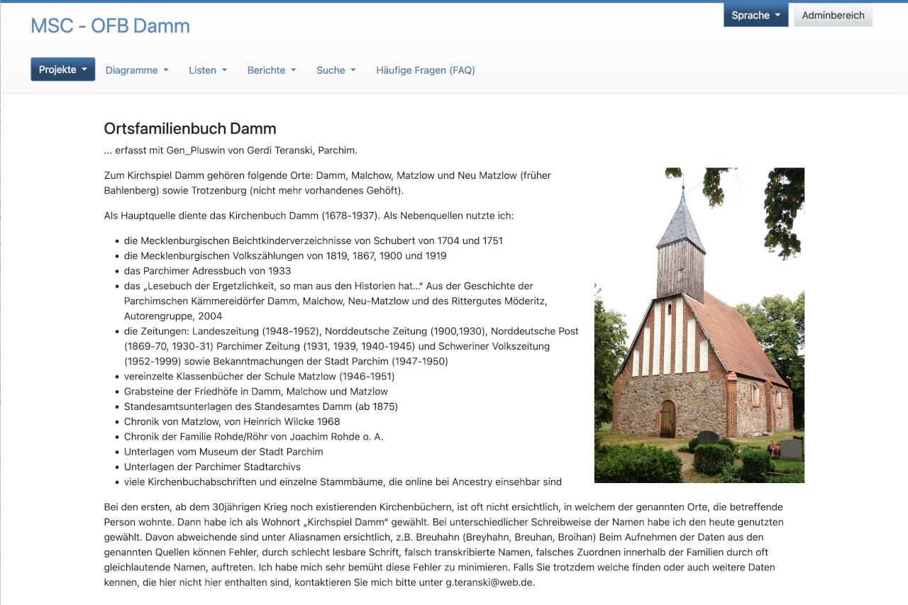 Heute konnten wir ein weiteres Ortsfamilienbuch unserer AG OFB im Datenraum online stellen. Gerdi Teranski hat das OFB Damm fertiggestellt und darin Daten zu 12250 Personen und 4970 Familien für den Zeitraum zwischen 1600 und heute erfasst. Zum Kirchspiel Damm gehören folgende Orte: Damm, Malchow, Matzlow und Neu Matzlow (früher Bahlenberg) sowie Trotzenburg (nicht mehr vorhandenes Gehöft).