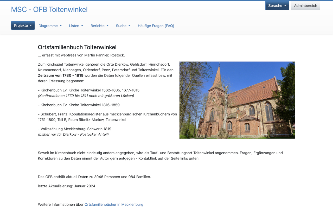 Zusätzlich konnten wir das von Martin Pannier erfasste Ortsfamilienbuch Toitenwinkel im Datenraum online stellen. Darin sind die Daten zu 3046 Personen und 984 Familien für den Zeitraum von 1780 bis 1819 erfasst. Noch nicht komplett erfasst sind die Konfirmationen zwischen 1779 und 1811 sowie die Volkszählung Mecklenburg-Schwerin 1819. Dies wird später in einem Update nachgereicht.