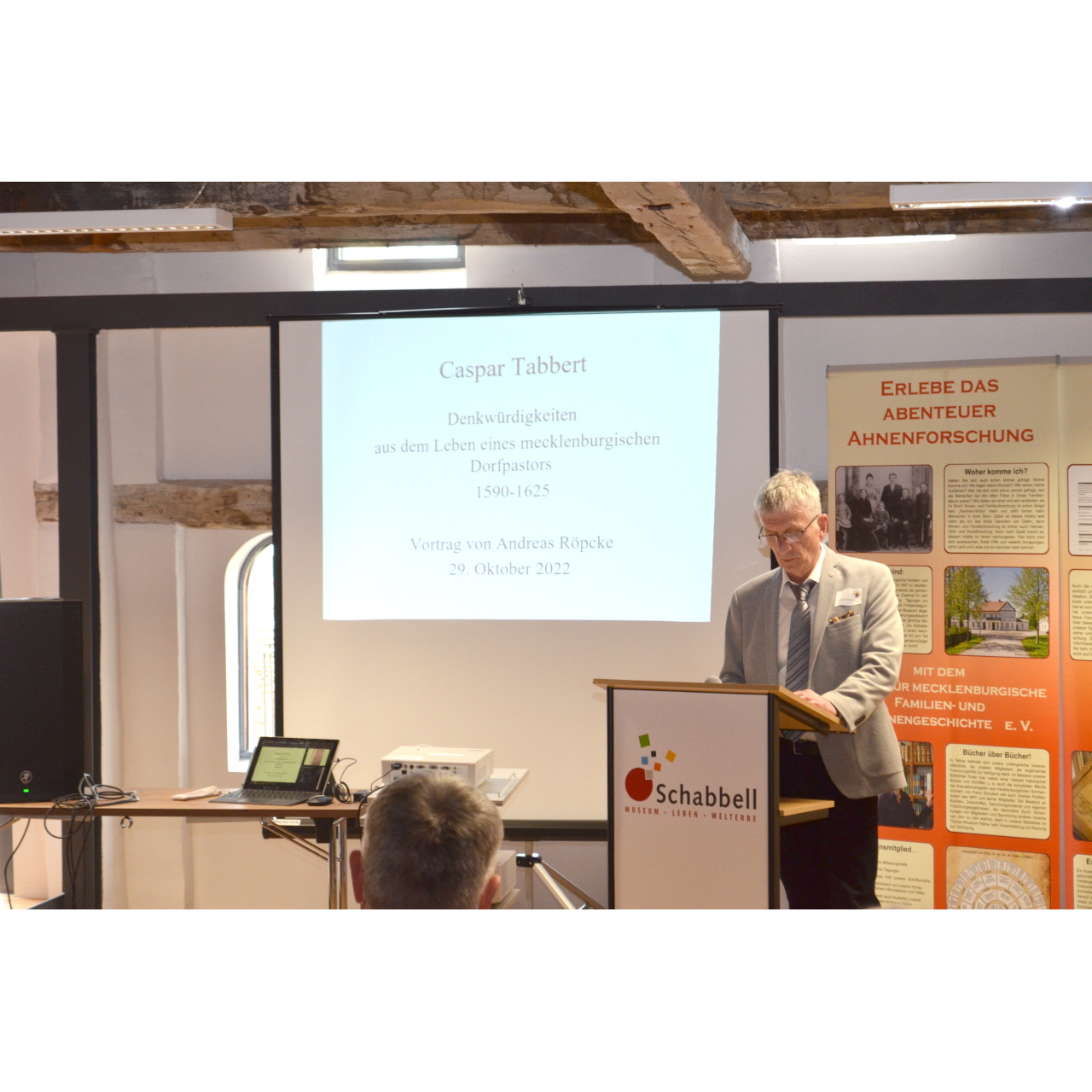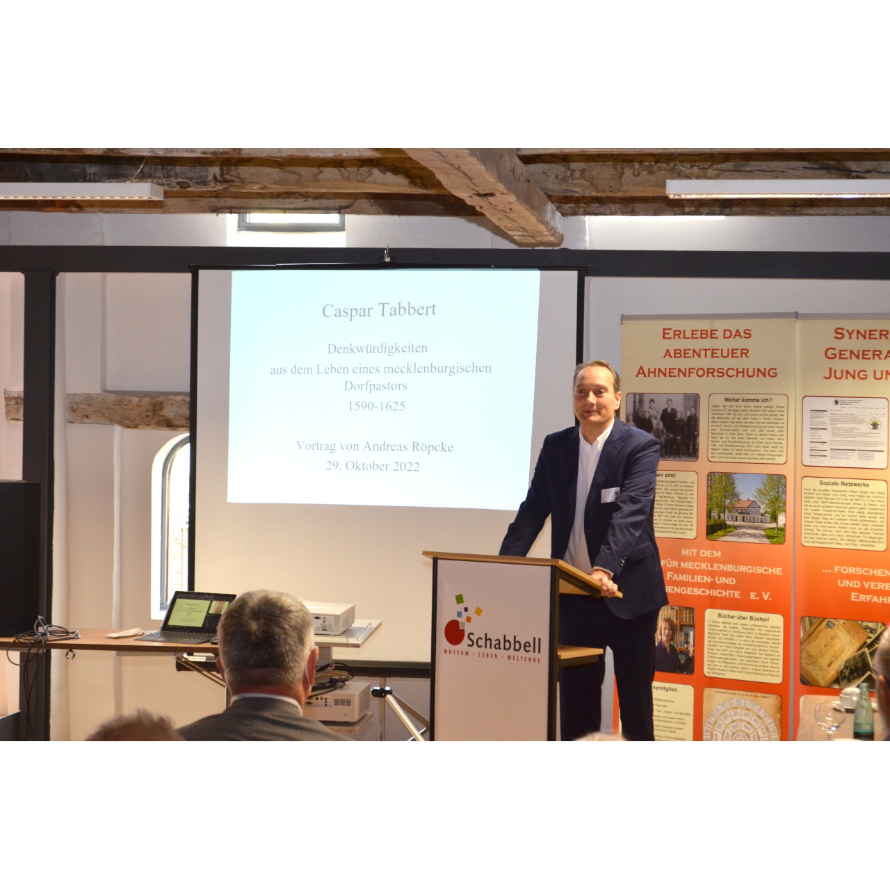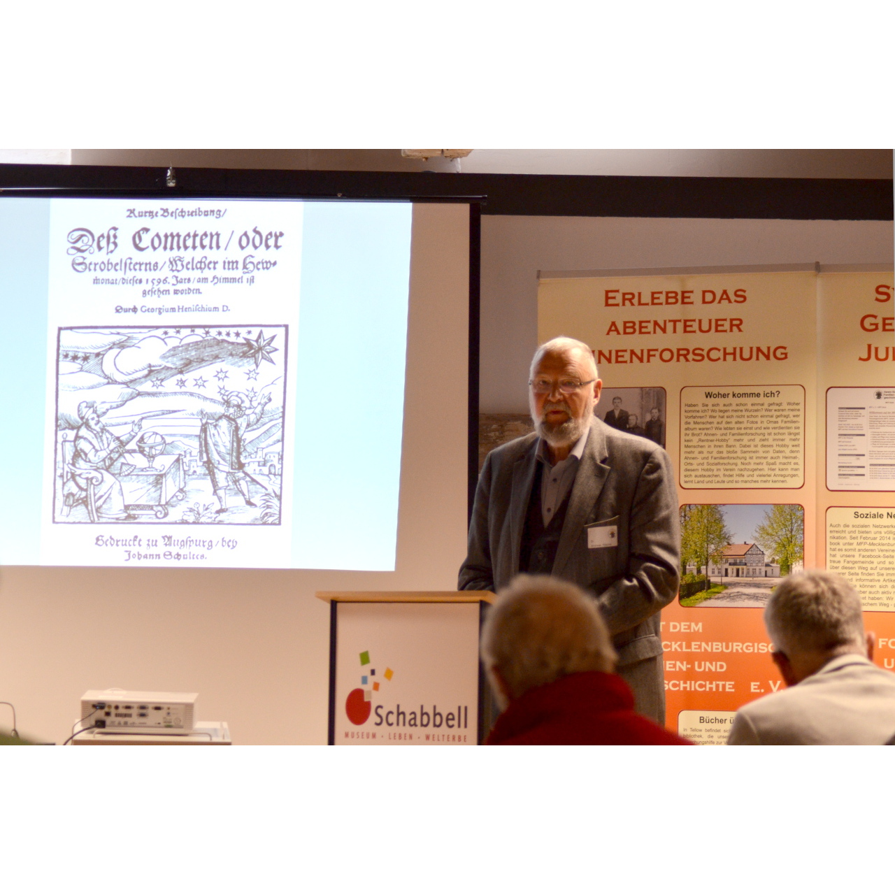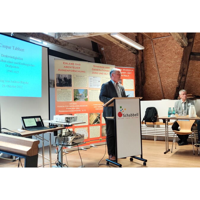 Am Samstag begannen wir nach der Begrüßung durch den Wismarer Bürgermeister Thomas Beyer mit drei interessanten Vorträgen. Den Anfang machte der Historiker und Archivar Dr. Andreas Röpcke. Er stellte uns eine Archivalie aus dem Landeshauptarchiv Schwerin vor. In seiner Funktion als Leiter dieses Archivs konnte er eine alte Handschrift des Pastors Casper Tabbert erwerben. Mit „Caspar Tabbert - Denkwürdigkeiten im Leben eines mecklenburgischen Dorfpastors“ berichtet er erstmalig über den Inhalt dieses als Chronik oder Tagebuch zu beschreibenden Dokuments. Tabbert beschreibt darin aktuelle Ereignisse seiner Zeit (1590-1625): Naturerscheinungen, Hexen, Aberglauben, Verbrechen und vieles mehr. Eine spannende Quelle, die zu Unrecht bisher nicht beachtet wurde.