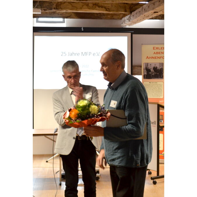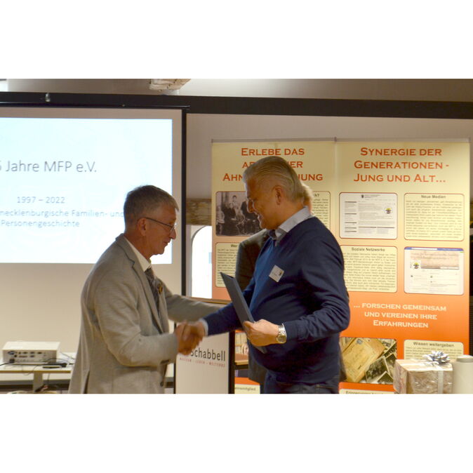 Im Verlauf des Festaktes wurden einige Mitglieder geehrt: die Redaktionskommission um Dirk Schäfer, Prof. Dr. Dr. Wulf von Restorff und Marion Esser erhielten für ihre langjährige erfolgreiche Arbeit ein Präsent mit Mecklenburgischen Spezialitäten. Mit einem Präsent wurde auch die Arbeit von Andre Adam, dem 2. Vorsitzenden des Vereins, geehrt. Damit wurden besonders seine Initiativen zur Erstellung der neuen Vereinshomepage, die Digitalisierung von Dokumenten und für eine Zusammenarbeit mit ancestry.de gewürdigt. Dankesurkunden für ihre Arbeiten an den verschiedenen Mitmachprojekten erhielten Owe Heincke (Kirchenbuchpatenschaften), Eva-Maria Friedland (Schäferkartei) und Hans-Georg Kunisch (Ortsfamilienbücher). Eine Ehrenurkunde für seine unermüdliche Arbeit zur Geschichte des Klosters Dobbertin erhielt Horst Alsleben.