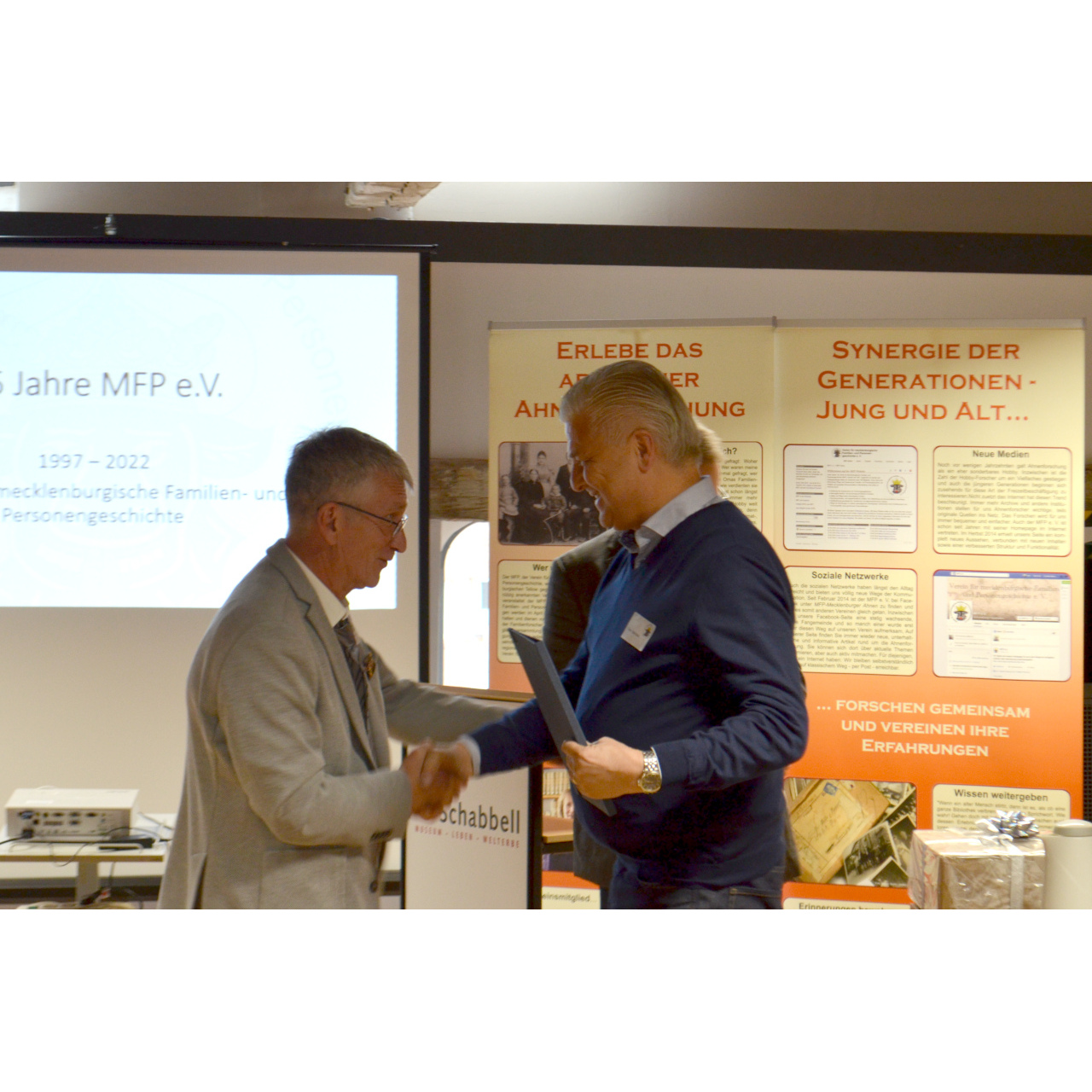 Am Nachmittag feierten wir in einem Festakt mit über 50 Teilnehmenden unser 25-jähriges Bestehen. Nach einer Festrede unseres 1. Vorsitzenden Andreas Parlow, ließ Dr. Dieter Garling die bisherige Geschichte Revue passieren. Er verlas dazu auch ein Grußwort von Prof. Dr. Gronau, der der bis 2014 der erste Vorsitzende des Vereins war. Weitere Grußworte folgten von Dr. Ostrop von der Stiftung Mecklenburg, Dr. Buchsteiner vom Heimatverband Mecklenburg, Prof. Dr. Tack von der Thünengesellschaft, Micha Glockemann vom Archivverein Wismar und Dr. Kohrt vom Pommerschen Greif.