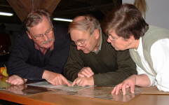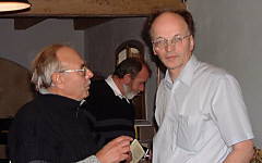 In der Tagungspause: Susemihl Experte und Mitorganisator des DGT 2003 Peter C. Clemens im Gespräch (linkes Foto); Fachsimpelei um den Heraldiker und Burg Schlitz Experten Jürgen Luttmann (außen Dieter Mombour und Frau aus Hohen Wangelin, rechtes Foto) (Fotos Garling).