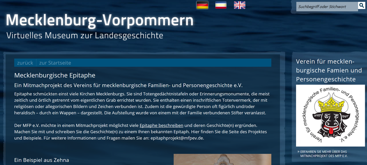 Der MFP e.V. möchte in einem Mitmachprojekt möglichst viele dieser Epitaphe beschreiben und deren Geschichte ergründen. Michael Voß aus Rostocker Wulfshagen hat uns einen reichen Schatz an Fotografien vieler Epitaphe zur Verfügung gestellt und die Nordkirche die Genehmigung für deren Veröffentlichung erteilt. Machen Sie mit und schreiben Sie die Geschichte zu einem Ihnen bekannten Epitaph! Zur Bearbeitung stellen wir Ihnen die Fotografien zur Verfügung und geben bei Bedarf weitere Hilfe. Alle Beschreibungen sollen in einer Sonderpublikation veröffentlicht werden.
