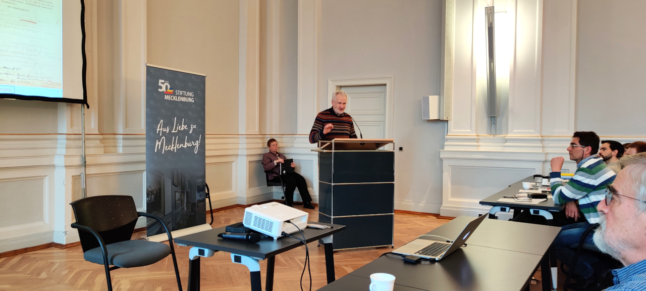 Nach der Mittagspause hörten wir Herrn Siebo Woydt mit dem Thema „Die Chronik von Langhagen – Werkstattbericht eines Zugereisten“. Als erst vor einigen Jahren Zugezogener, übernahm er das Amt des Ortschronisten und berichtete uns über das vorgefundene Material (6 dicke Ordner Papier) und das daraus entstandene Werk (eine knapp 1000 Seiten digital verfügbare Übersicht über alle in den Ordnern vorgefundenen Ereignisse und eigene Fundstücken). Auf Nachfrage erhielt er viele Vorschläge und Informationen für die Weiterarbeit an der Chronik des Ortes Langhagen bei Serrahn.