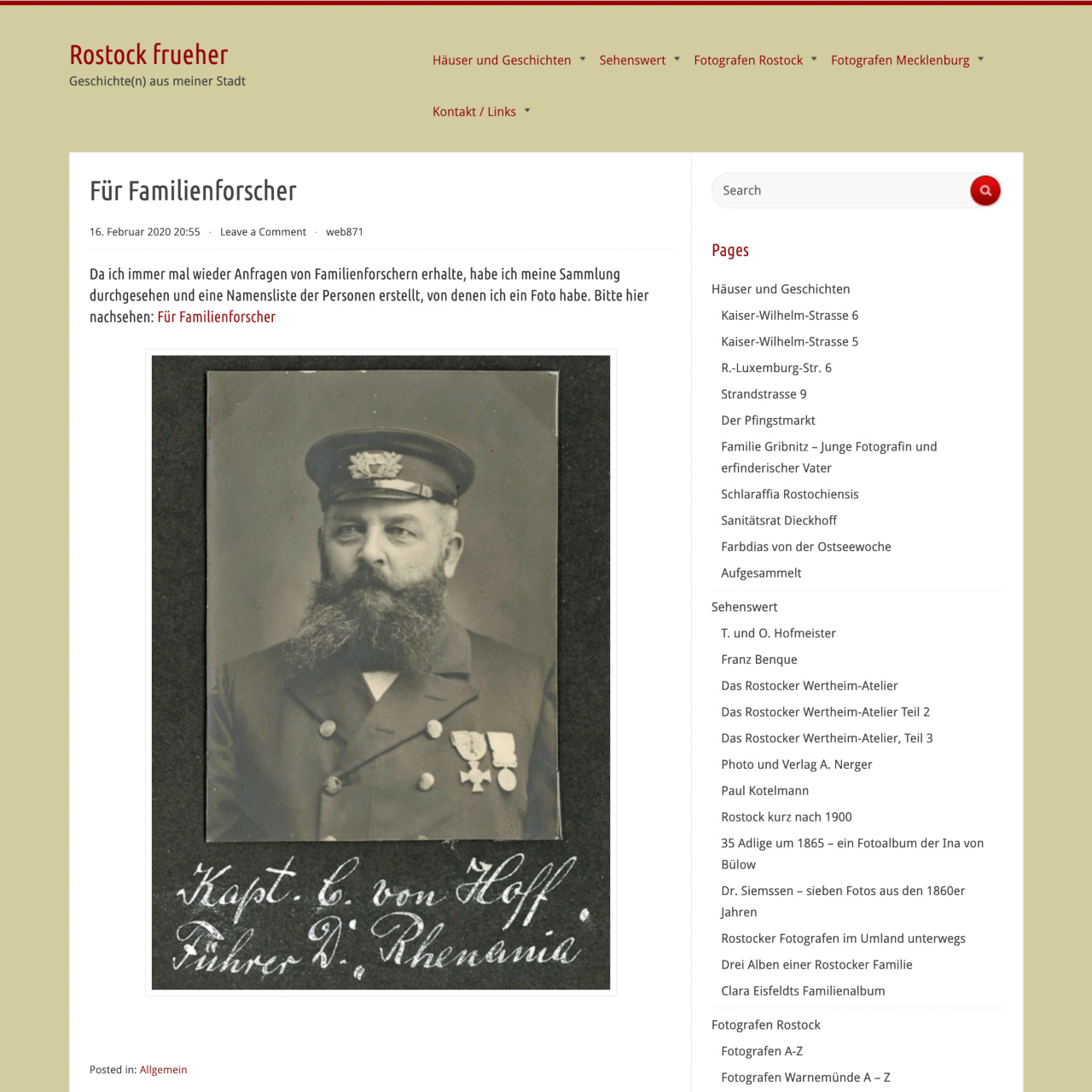Auf unserer Frühjahrstagung am 04.04.2020 wollte Thomas Werner zum fotohistorischen Thema "Goldschrift, Kopfhalter und Wespentaille. Zur Datierung von Atelierfotografien aus der Zeit 1860 bis 1920" vortragen. Da nun der eine oder andere etwas mehr Zeit hat, möchte er in seiner Fotosammlung "Rostock frueher - Geschichte(n) aus meiner Stadt" auf einen Service hinweisen, den er für Familienforscher eingerichtet hat. Herr Werner hat seine Fotosammlung durchgeschaut und eine Namenliste der Personen erstellt, von denen er ein Foto hat. Die Liste wird fortlaufend aktualisiert. Bei Interesse an einer Person bittet der Autor, Kontakt zu ihm aufzunehmen.