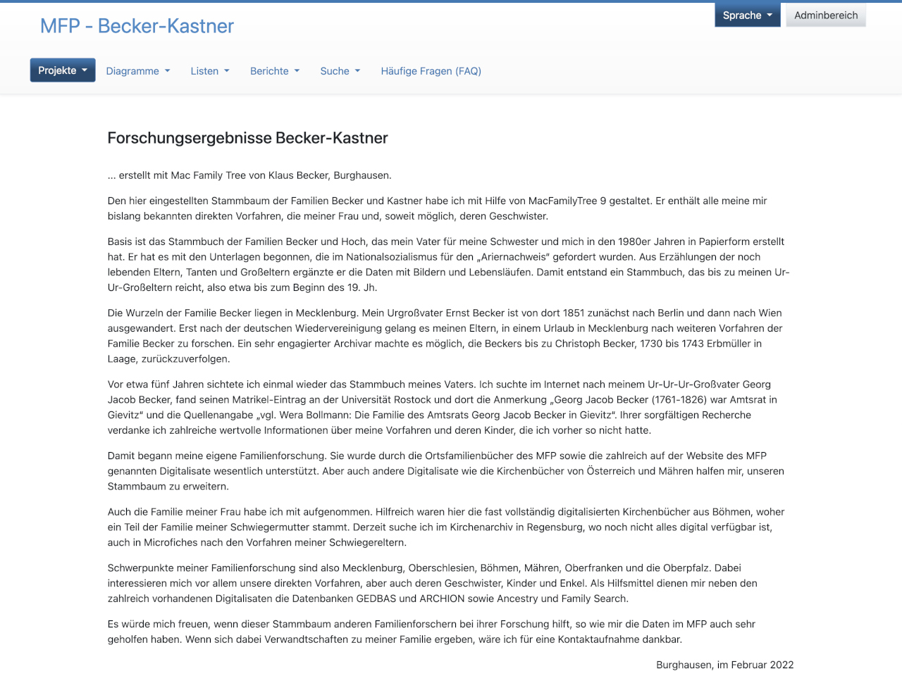 Wir bedanken uns bei Klaus Becker für die Möglichkeit, seine genealogischen Daten im Datenraum des MFP e.V. präsentieren zu können.